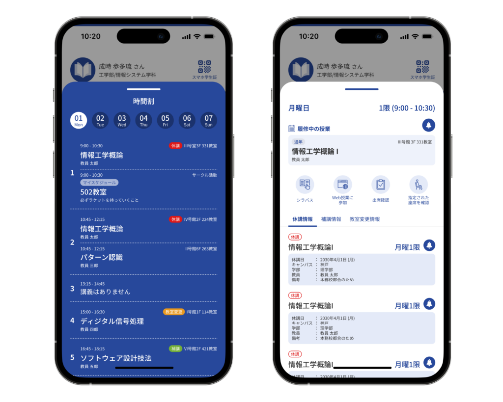 教務システムと連携し、利用者の授業時間割や休講・補講・教室変更を表示。追加スケジュールも作成可能です。